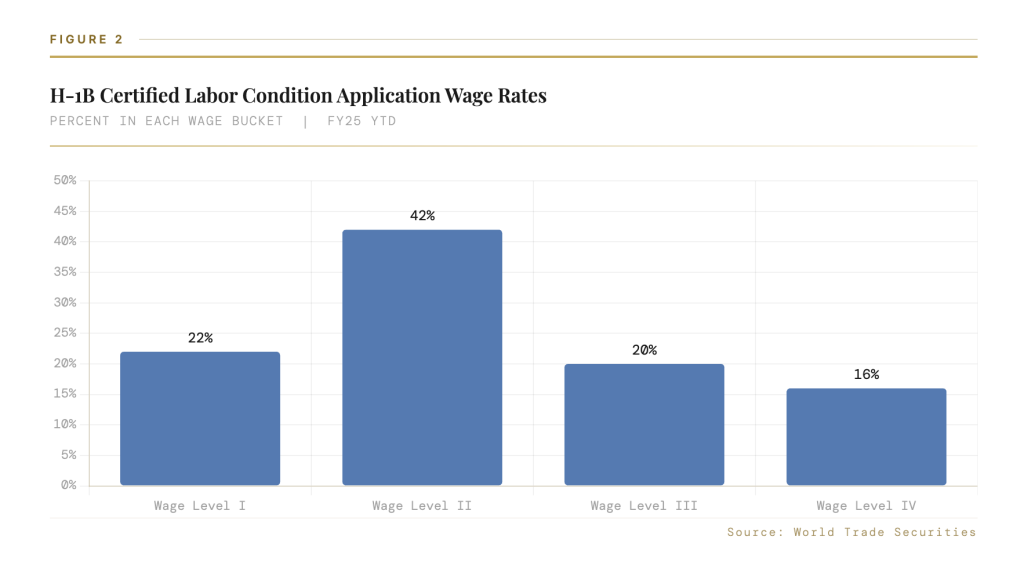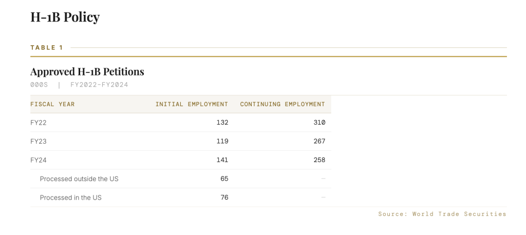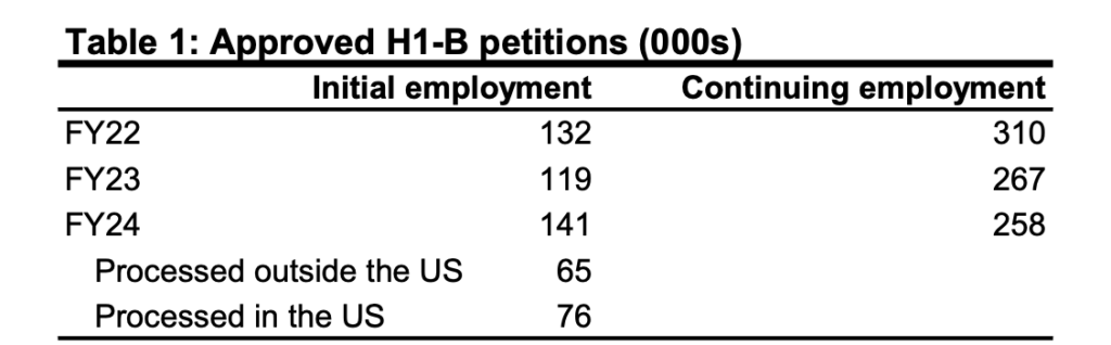 Last week the White House announced there will be a new $100,000 H1-B visa fee for the next 12 months. It will apply only to visas for new employment, in a speciality occupation, for a worker currently outside the US. It does not apply to H1-B renewals, which we interpret to include extensions at an existing employer or a change of employer. The DHS Secretary can, however, provide an exemption, which can be done for an individual person, company, or entire industry. In addition, the Labor Secretary will likely raise the “prevailing wage level” guidance used to help set salaries for H1-B applicants. President Trump also changed H1-B policy in his first term, though policies that led to higher denial rates were eventually overturned in court. The H1-B is an employer-sponsored visa program primarily for speciality occupations in which recipients possess “theoretical and practical application of a body of highly specialized knowledge” and have at least a bachelors degree. Today, the program is best known for bringing in technology work- ers, especially from India.