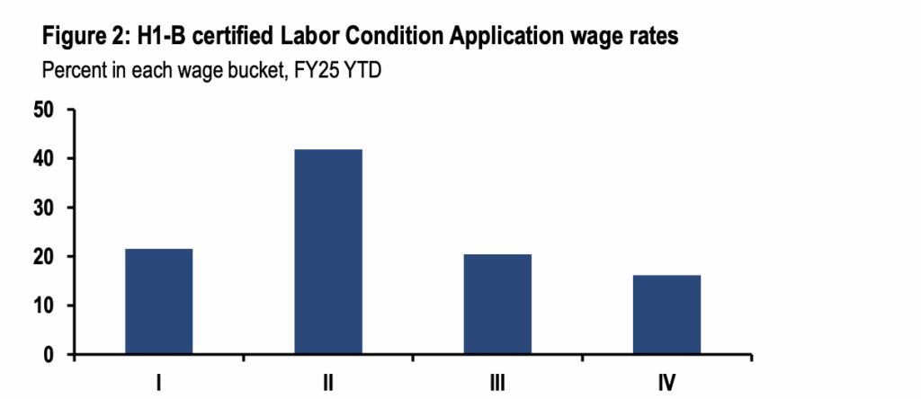 However, the reverse is also possible, because the fee only applies to applicants “currently outside the United States.” The number of petitions processed inside the US closely corresponds to the number of people who are switch- ing US visa types, with 71% of these being students in FY24. Changes to prevailing wages could affect a wider swath of H1-B visa petitions, including those for continuation of employment. That would apply for a job or employer change (62% of continuations in FY24), and also in some cases for a simple extension of a current job. The Department of Labor sets prevailing wage bands that are currently estimated around the 17th, 34th, 50th, and 67th percentile of the wage band. In FY25 close to two-thirds of H1-B applications have had declared minimum wage rates in the first two bands, and another 20% in the third band, consistent with the visas going toward workers with more junior wage rates.